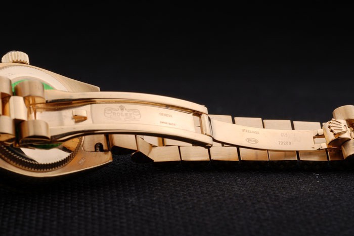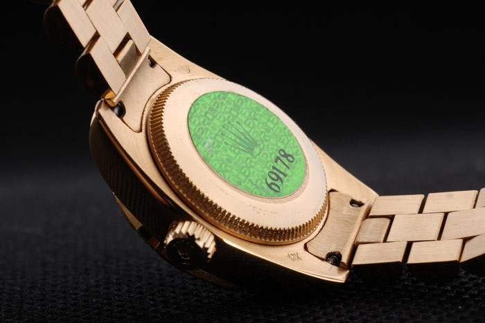 Retour: plaqué or jaune 18k inoxydable cas de poussée en arrière en acier avec le vert Rolex logo stamp