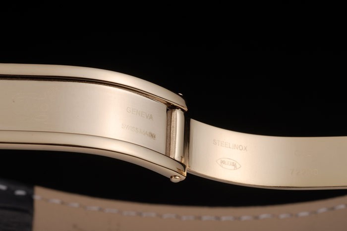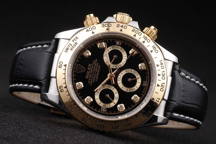 Bracelet en acier inoxydable brossé: crocodile Bracelet en cuir noir avec Rolex gravé or jaune 18 carats pliez en boucle déployante affichant la Rolex logo