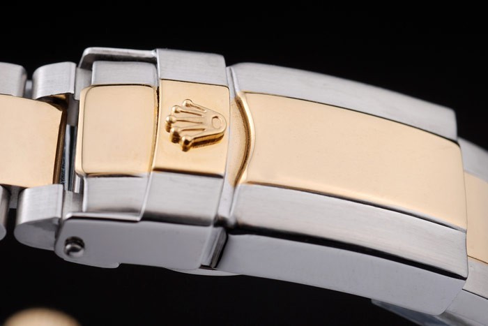 Le genre: bracelet en acier inoxydable brossé et lien or rose avec gravure Rolex à l’intérieur de la boucle déployante et Rolex logo: Hommes