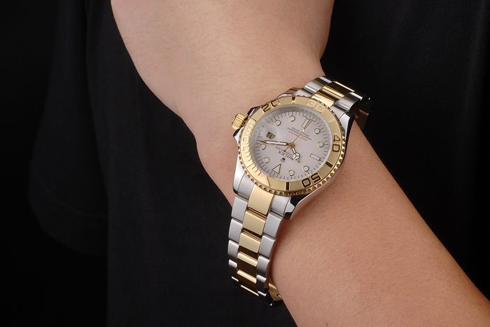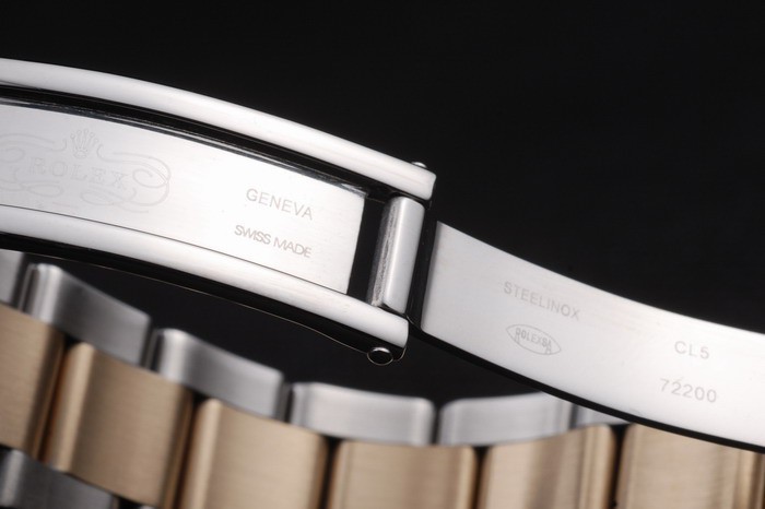 Bracelet en acier: Deux tons bracelet lien brossé et acier inoxydable de ton or avec gravure Rolex plier en boucle affichant la Rolex logo